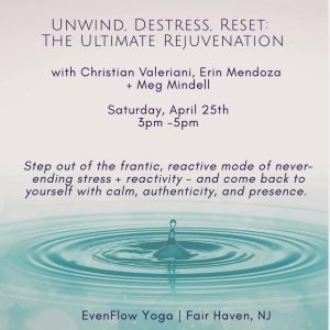 Unwind, Destress, Reset: The Ultimate Rejuvenation This workshop will change your entire day and you’ll leave feeling amazing! Set aside this time for you to: -Decrease stress and anxiety -Improve physical and emotional health -Reduce burnout -Increase focus and concentration -Enhance resilience -Improve sleep quality -Increase capacity for joy and relaxation Join us in a two-hour workshop filled with mindfulness meditation, gentle yoga, guided visualization and breathwork. We will explain the how and why of meditation, the mechanics of breathing…
